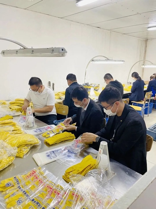 團員青年們在實驗生產線職工師傅的指導下,全身心投入到手套包裝工作中,大家一干就是將近兩個小時, 包裝完成了2000余副手套。