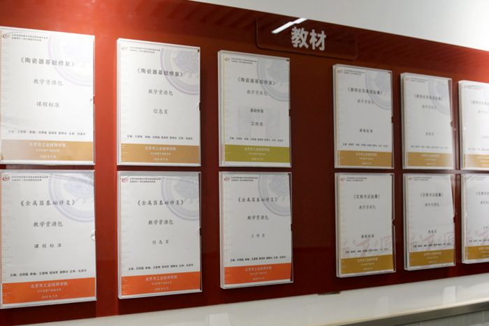 沒有成型的教材,王愛梅等老師就與這些特聘專家和技能大師一起探討,與團隊教師合作搭建課程體系。現已完成10門一體化課程標準和教材、學材的開發,并打通了中高級直升人才培養機制,同時完成主編《陶瓷器基礎修復》《陶瓷器文物修復》,參編《金屬器修復》等課程資源包。