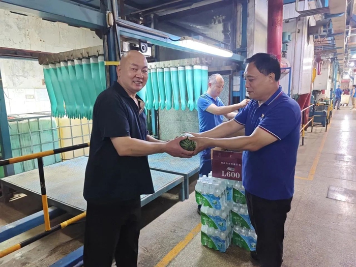 就在“職工之家”開放之際,一份清涼也送到了職工手中。近日,華騰橡塑領導專程來到瑞京公司生產一線,向在酷暑中仍然奮戰在一線的干部職工送上清涼飲品和爽口西瓜,并對大家表示慰問,叮囑大家要做好防暑降溫工作。