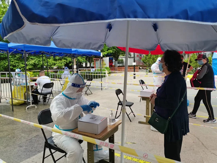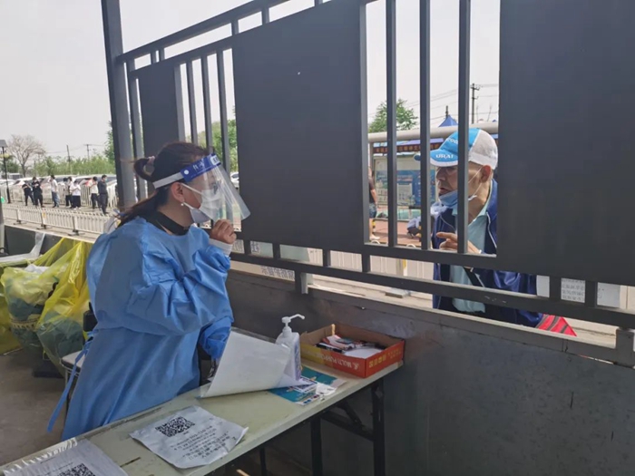 共產黨員冀高娜在朝陽區興隆社區參加核酸檢測志愿服務。