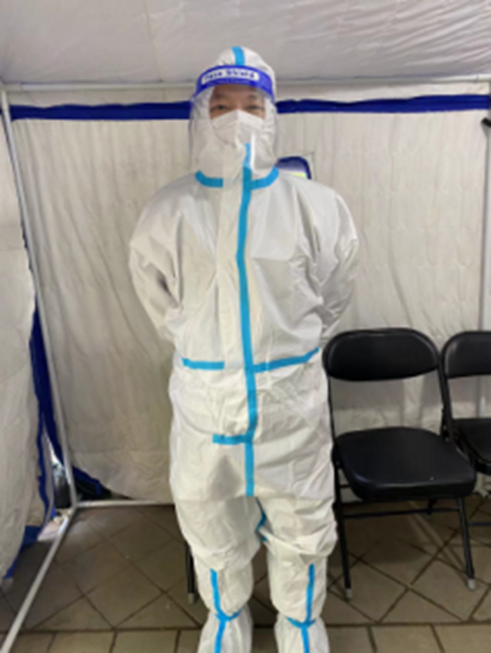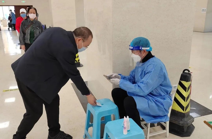 共產黨員張增惠在延靜里社區華商大廈檢測點參加防控志愿服務。