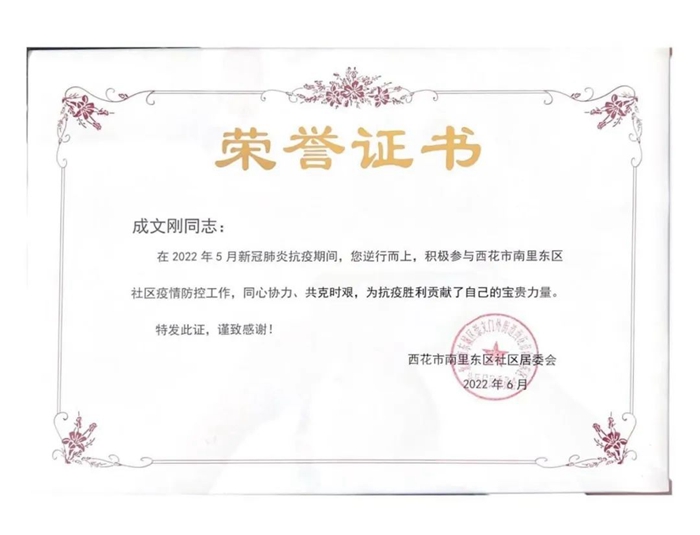 近日,東城區(qū)西花市南里東區(qū)社區(qū)居委會(huì)為化研院共產(chǎn)黨員成文剛頒發(fā)了榮譽(yù)證書(shū),以表彰他積極參加社區(qū)防控工作。