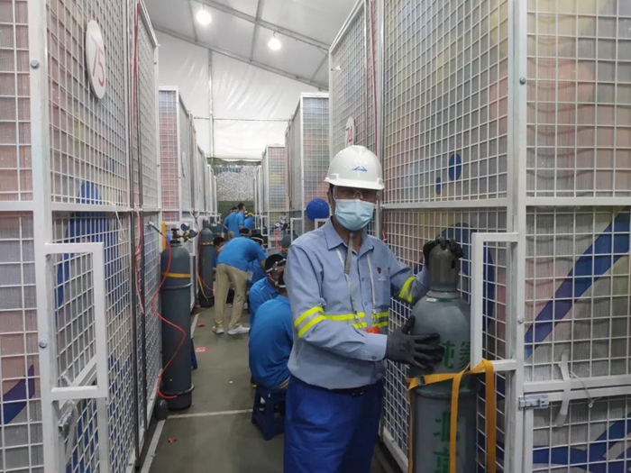 根據(jù)指令,6月30日凌晨4點開始灌裝氣球。為了精準對接氣球“灌滿”100個特制移動籠房的任務,北普公司領(lǐng)導小組將全部人員分成了8個工作小組,每個小組由3人組成,組長都是由一名曾經(jīng)參加過“9.3閱兵”和“新中國成立70周年慶典”保障任務的老員工擔任,每個小組對接12-16個籠房。他們的任務是在規(guī)定的時間內(nèi)將鋼瓶推放并綁定在指定位置,裝表、聯(lián)管、上槍、調(diào)壓,充氣作業(yè)開始以后還不停地巡視、加壓、換瓶,目標只有一個,配合協(xié)作單位在規(guī)定的1個半小時時間內(nèi),罐裝好10萬只氣球。氣球充好以后,還要以最安全的方式、最快的速度將現(xiàn)場300多支高純氦氣鋼瓶撤出,確保100個特制移動籠房能夠準時出發(fā)。