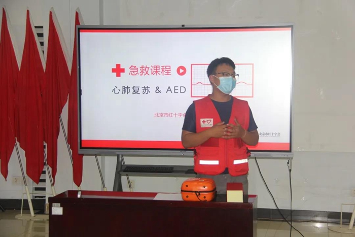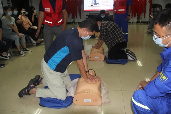 培訓(xùn)現(xiàn)場,紅十字會講師講解了意外情況下的心肺急救知識,并利用模擬假人詳細(xì)講解了心肺復(fù)蘇術(shù)和自動體外除顫器(AED)的操作要領(lǐng)。