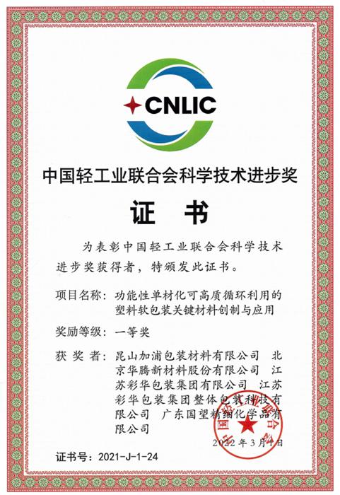 日前,在北京召開的中國輕工業聯合會五屆二次理事會、中華全國手工業合作總社八屆二次理事會上傳來喜訊,華騰新材與江蘇彩華包裝集團聯合完成的科技項目“功能性單材化可高質循環利用的塑料軟包裝關鍵材料創制與應用”榮獲中國輕工業聯合會“科學技術進步獎一等獎”。