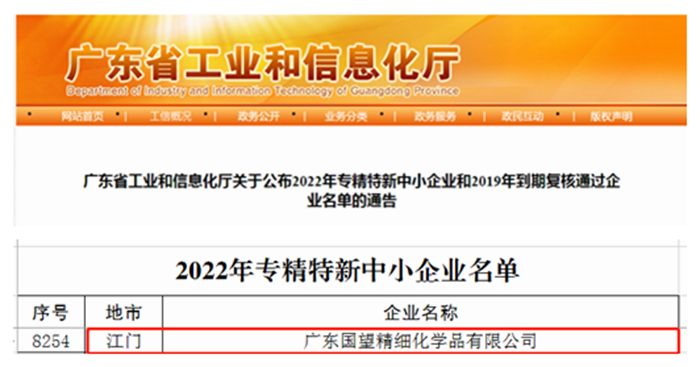 春節(jié)前夕,從廣東傳來(lái)好消息,華騰新材所屬?gòu)V東國(guó)望精細(xì)化學(xué)品有限公司成功入選廣東省2022年“專精特新”中小企業(yè)名單,成為北京化工集團(tuán)第6家“專精特新”企業(yè)。