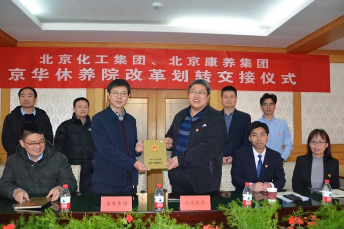 北京康養集團副總經理秦有明、副總會計師秦磊,北京化工集團北化房地產公司黨總支書記、董事長高振宇,集團相關部室負責人出席交接儀式。北京化工集團與康養集團代表在劃轉資產及有關資料清單上簽字,雙方還與自愿安置到康養集團的職工簽署了新的勞動合同。