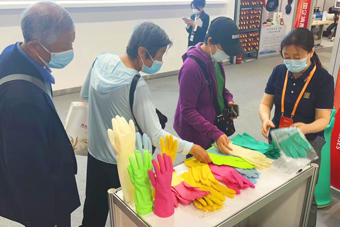 在5天的參展中,華騰橡塑展位前顧客絡(luò)繹不絕,大家圍攏在展位前不斷詢問手套性能,并在試戴體驗(yàn)后紛紛購買。在眾多產(chǎn)品中,白丁腈手套銷量最高,平均日銷量過半,而軟丁腈手套由于其食品級(jí)的配方,而且具有致敏性低,耐油性、耐酸堿、耐磨性等突出特性,廣受顧客喜愛。