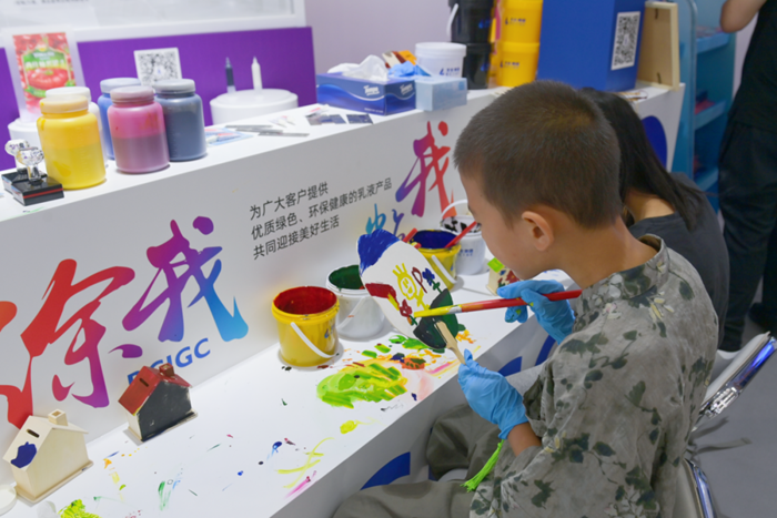 在“涂我、粘我”展區,大朋友、小朋友們紛紛拿起小扇子、小木制房子,用不同的涂料在上面作畫、上顏料;在干箱手套互動區,觀展者興致勃勃地套上干箱手套,模擬化學試驗操作,將試劑滴入不同化學液體中,觀察其中的變化;在防靜電手套互動區,觀眾們紛紛體驗不戴手套的“麻酥”感和戴上手套后的安全感。3個互動區使觀展者在動手參與中了解產品的特性,對化學讓生活更美好有了切身的感受。